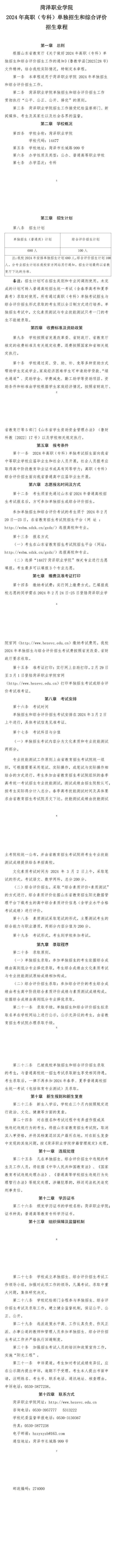 2024年菏泽职业学院单独招生、综合评价招生章程